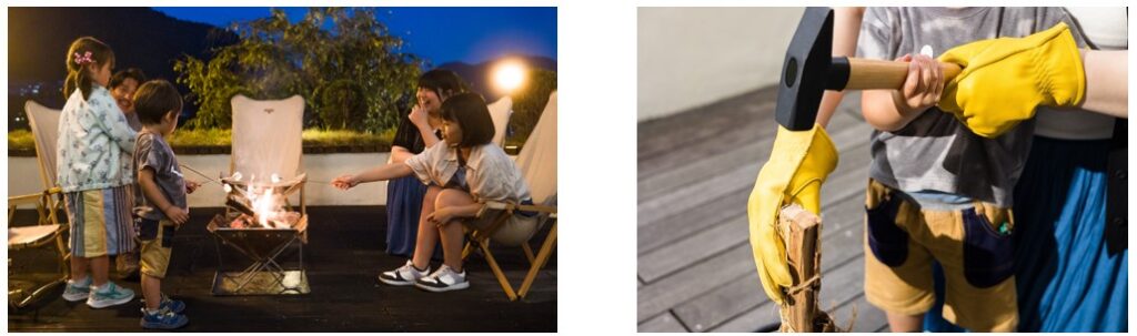 ホテル1階のウッドデッキにて焚火体験を行うことができます。薪の香りに包まれながら心地よい時間を過ごすことでリラックスし自然と一体になるひとときをお楽しみいただけます。焚火には「集中」と「リラックス」を自然な形で得られる効果があるとされており、普段は話せないようなことも自然と話せるようになりご家族の絆を深めることができます。岐阜のクラフトビールや焼きマシュマロもご用意しておりますので皆で火を囲みながら時間も忘れるような貴重な体験をご提供します。