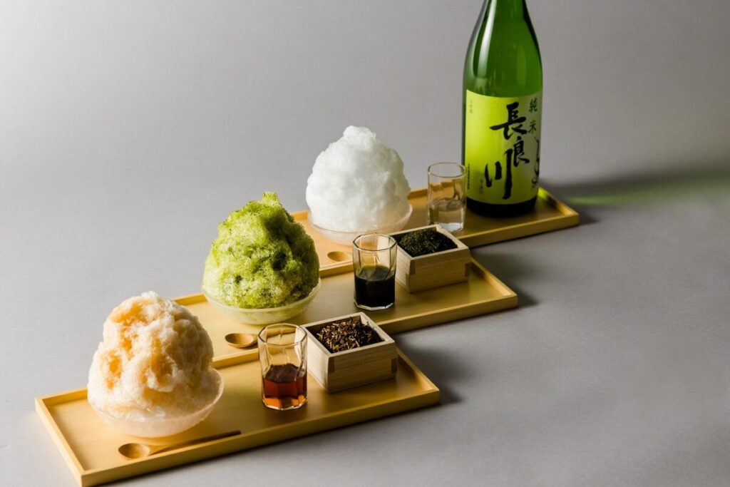 夏限定で無料にてかき氷を提供します。日本酒・美濃いび抹茶・美濃いびほうじ茶からシロップをお選び頂けます。また、お子様にはココアのシロップもご用意しております。