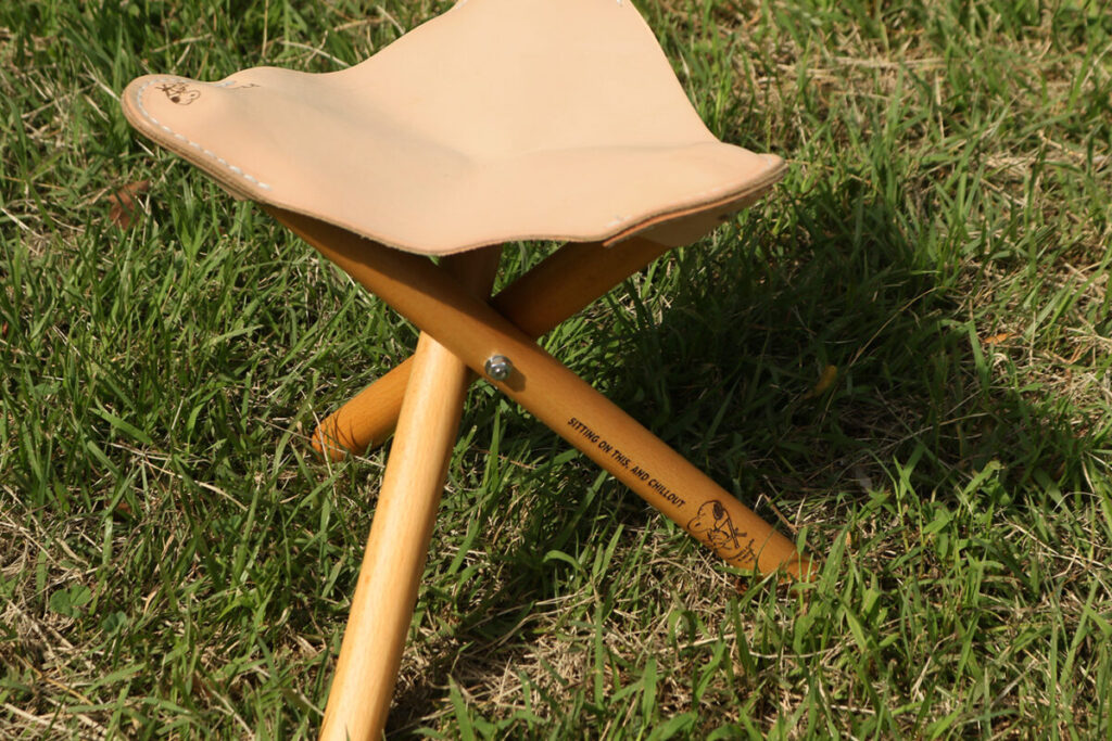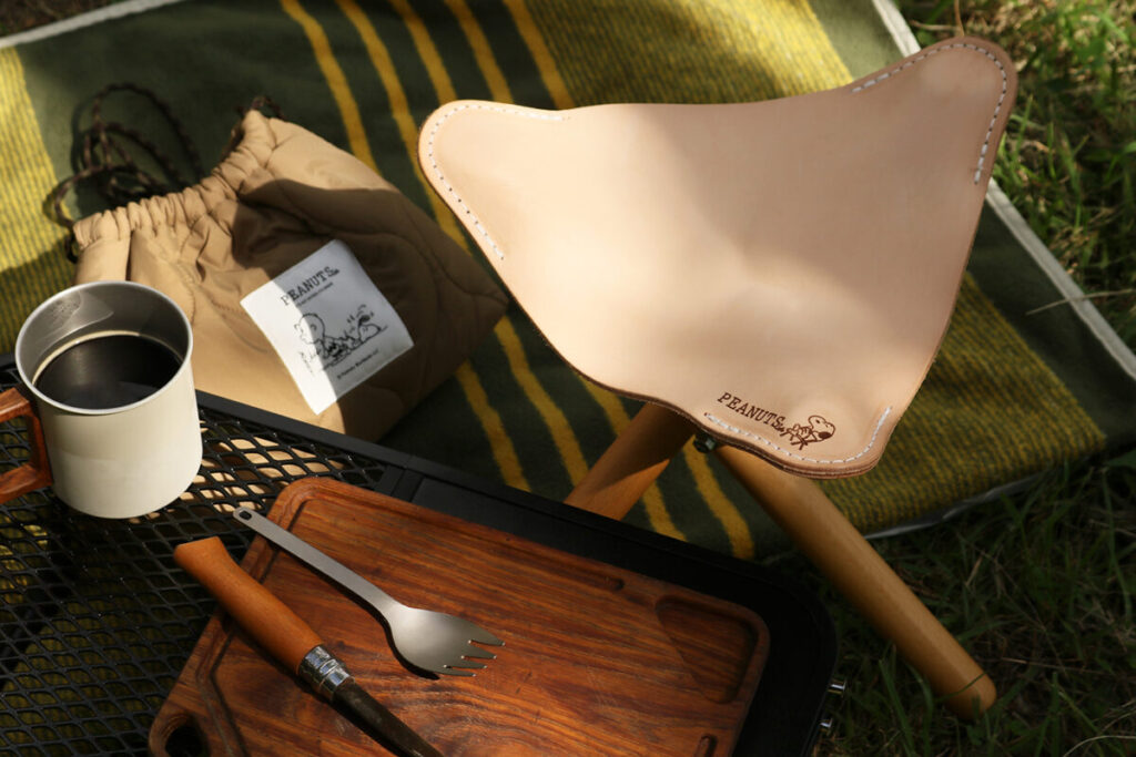 同製品は、座面に使うほどに味わいが出るヌメ革を使用し、脚には頑丈さに定評のあるビーチウッド(ブナ材)を使用した折りたたみ式の三脚チェアーとなる。椅子に座るスヌーピーなどがレーザー加工でさりげなく施されているのも特徴だ。キャンプから室内での使用にもピッタリで、使い込むほどに育っていく風合いをあわせて楽しんでみてはいかがだろうか。