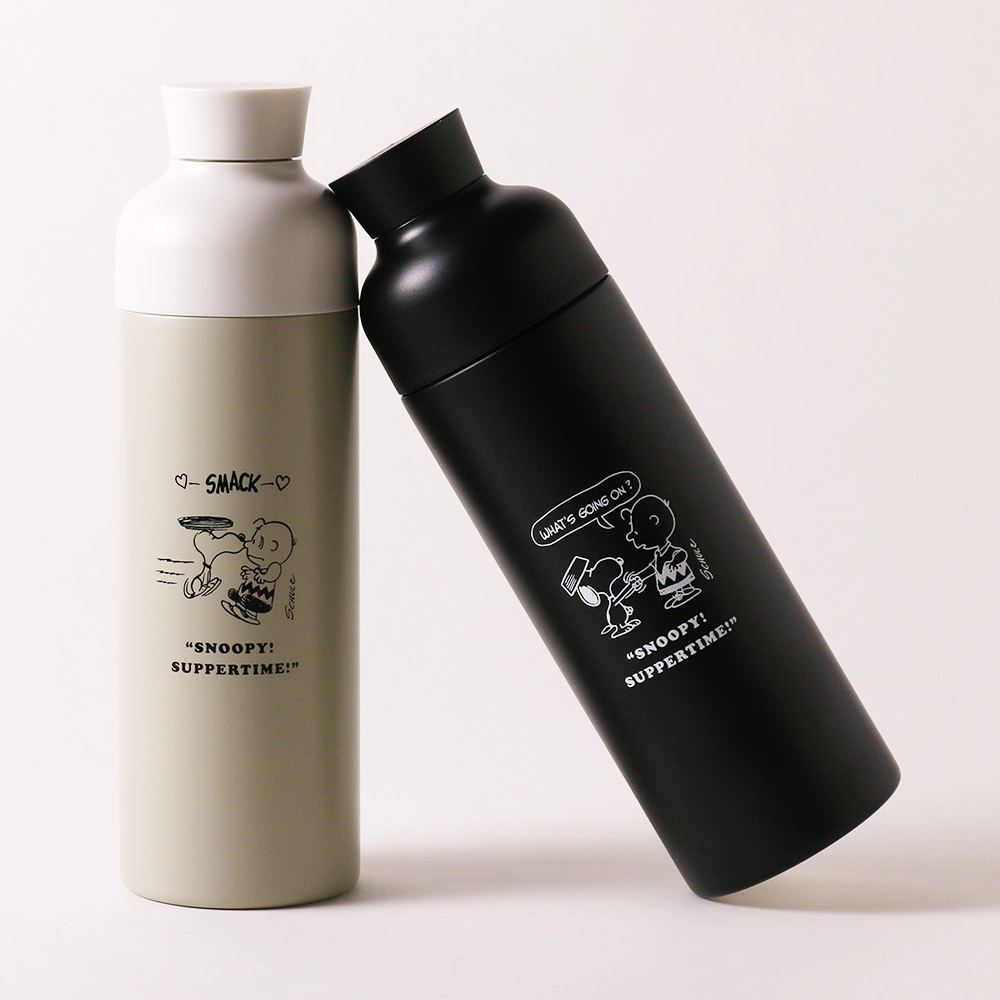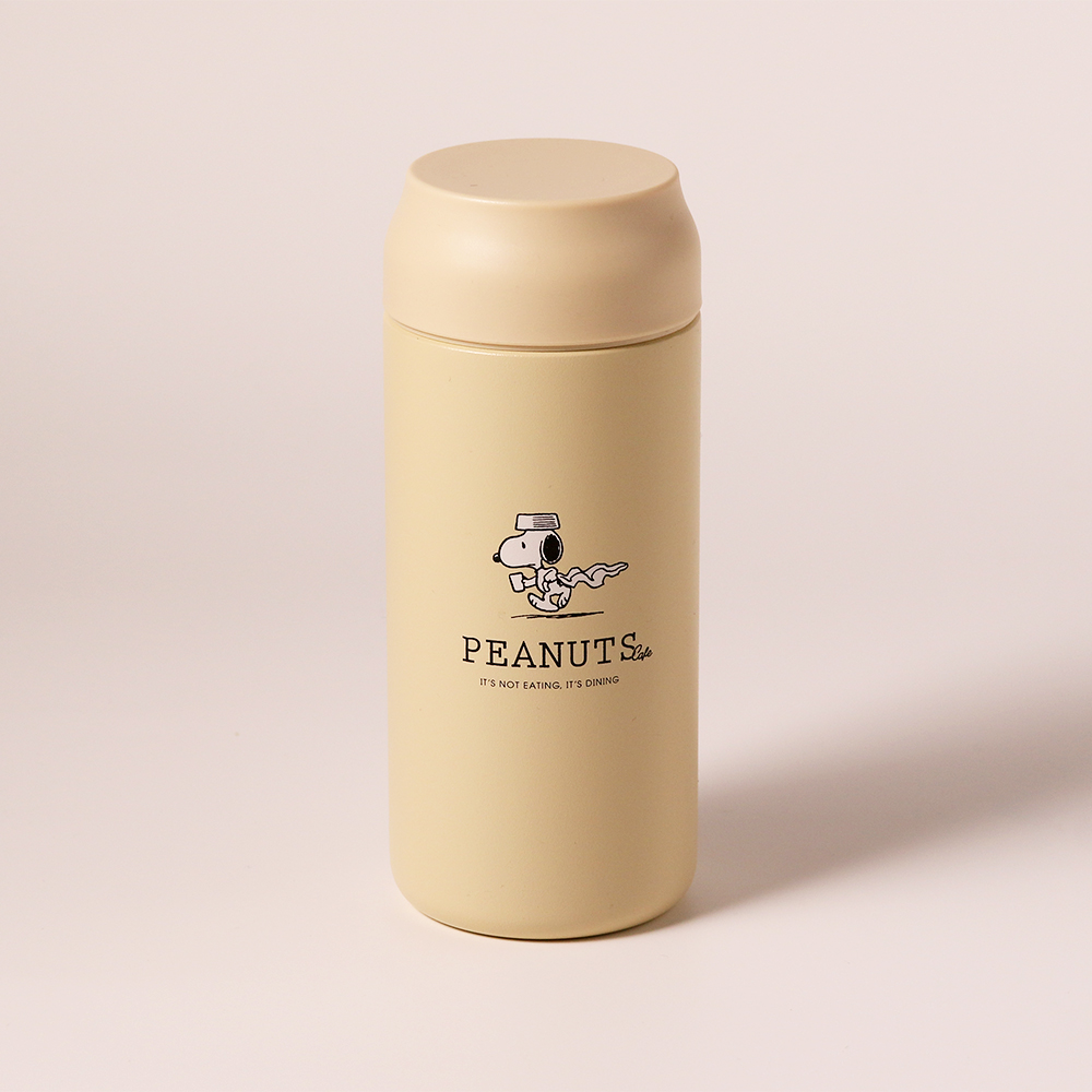 PEANUTS Cafeでおなじみのドッグディッシュをかぶったスヌーピーがデザインされているステンレスボトル。