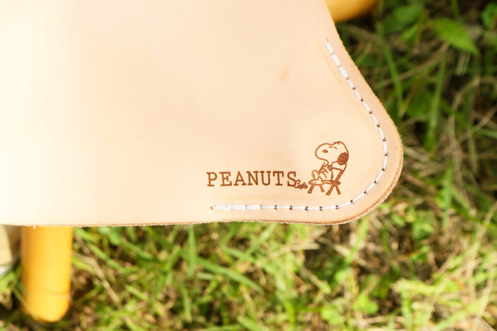 ヌメ革で作られた折りたたみ式の三脚チェアーに、椅子に座るスヌーピーをレーザー加工でさりげなく施しました。