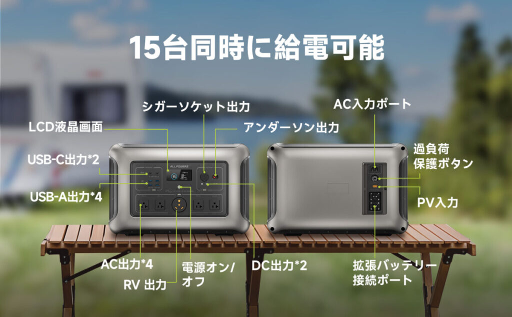 ・出力:合計15口(AC4口、USB4口、Type-C2口、DC/シガーソケット4口、RV出力1口)