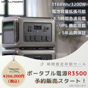 ポータブル電源とソーラパネルの開発から販売までを手がけるALLPOWERS株式会社は、2023年5月20日(土)よりALLPOWERS公式サイトとアマゾン店にて、同社の製品「ポータブル電源R3500」の予約販売を開始した。また2023年6月15日(水)までの予約購入で価格が30%オフの266,000円(税込)となるうえ、メルマガ登録でさらに19,000円OFFになるセールを実施している。