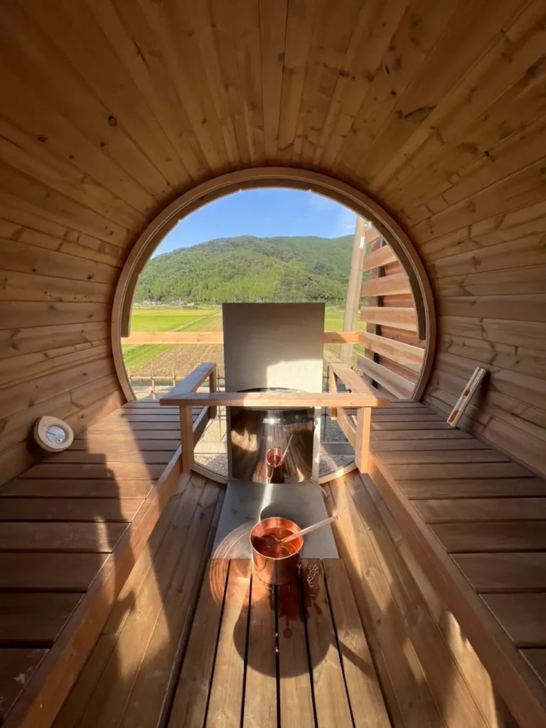 通常のグランピングとは一線を画し、家族や友人と利用できる滋賀県産信楽焼の風呂釜を配置した完全プライベート空間に加え、テラスからの眺望も滋賀県の風情を存分に楽しめる設計となっています。