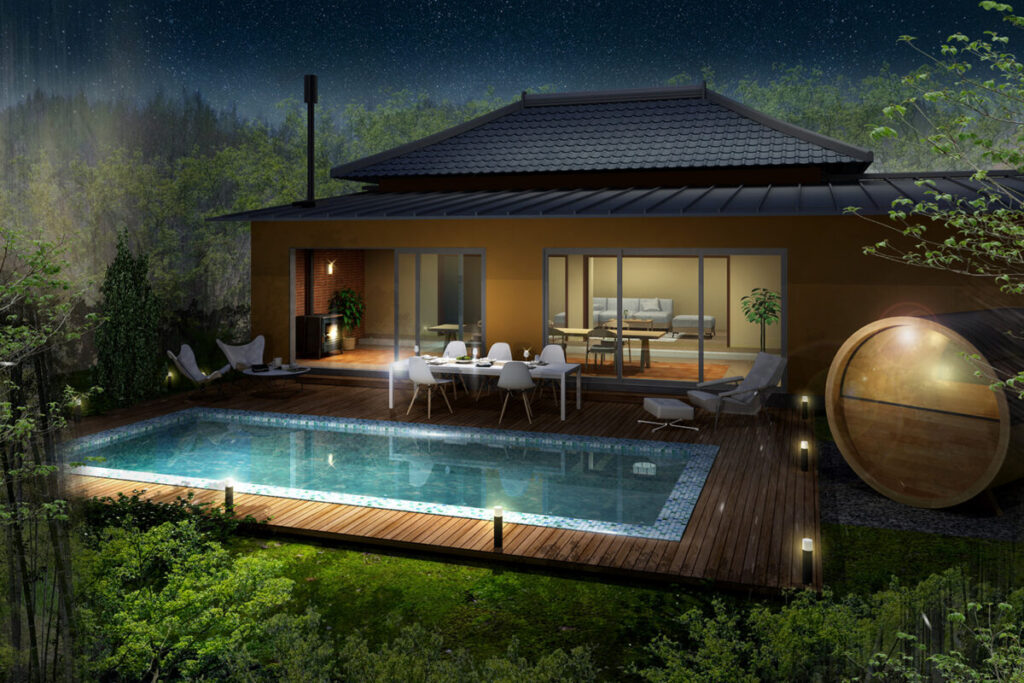 古⺠家をフルリノベーションした1棟貸切仕様の2階建てプライベートヴィラは2種の客室温泉⾵呂とプール、サウナとこれ以上ない充実の専⽤設備をご⽤意。