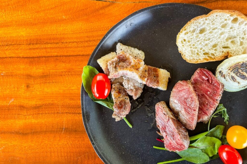 ご滞在の際のお食事には、2023年度のカナダ&ロンドン品評会で最高の「プラチナム賞」をW受賞した高品質なオリーブオイルを楽しんでいただくとともに、オリーブオイルの残滓を乾燥させたものをイノブタに与え、脂質が極上の旨みへと変化したお肉をご賞味ください。