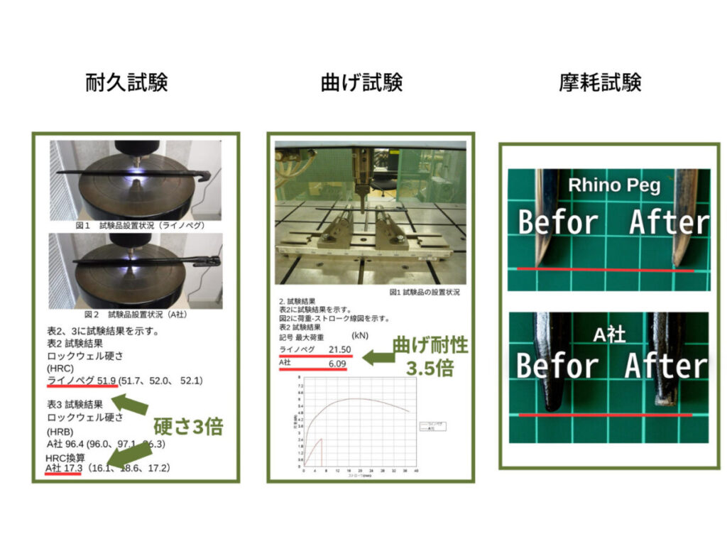 一般的にかなり強いとされている鍛造ペグと比較しても、3倍〜3.5倍の耐久力があります。