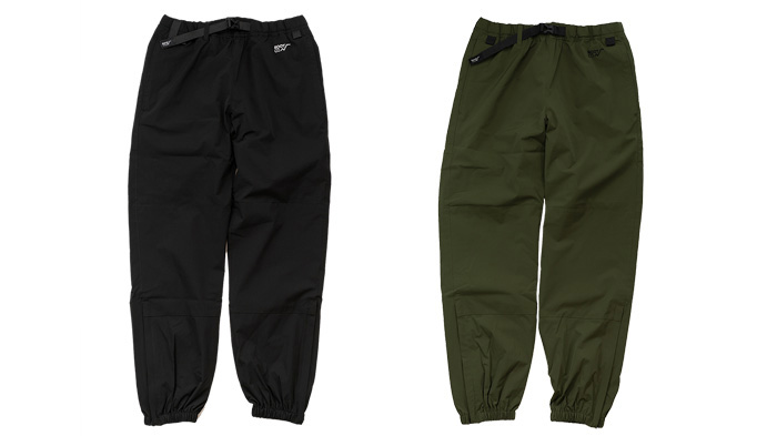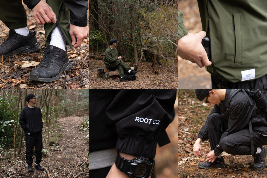 裾にはサイドジップを採用し、靴を履いたままでの着脱が可能に。また、ROOT CO.のアウトドアパンツでは定番のギアループや8つのポケットを搭載し、使いやすさを強化しています。ウエストはゴム仕様のイージーパンツタイプ。