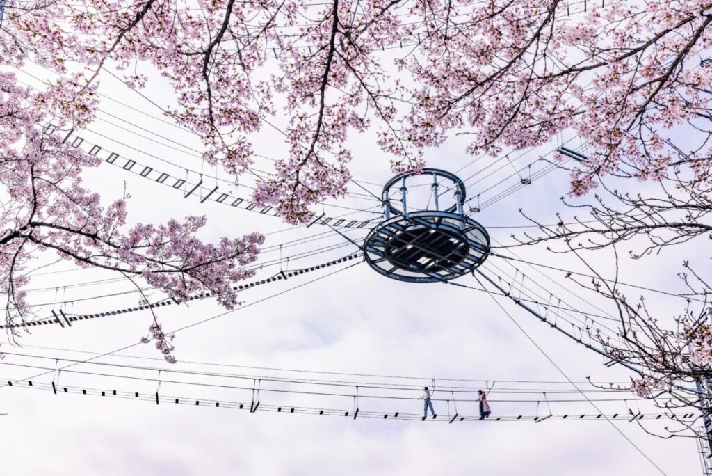 「ペアリフト」では、斜面一面に咲く桜のほか、桃、レンギョウ、山吹などの色鮮やかな景色を楽しめる“空中お花見”、標高370mにそびえたつ絶叫吊り橋「風天」や絶叫アトラクション「極楽パイロット」では桜を見下ろしながら楽しむ“絶叫お花見”、自走式カート「F-1カート」に乗れば“お花見ドライブ”が楽しめます。