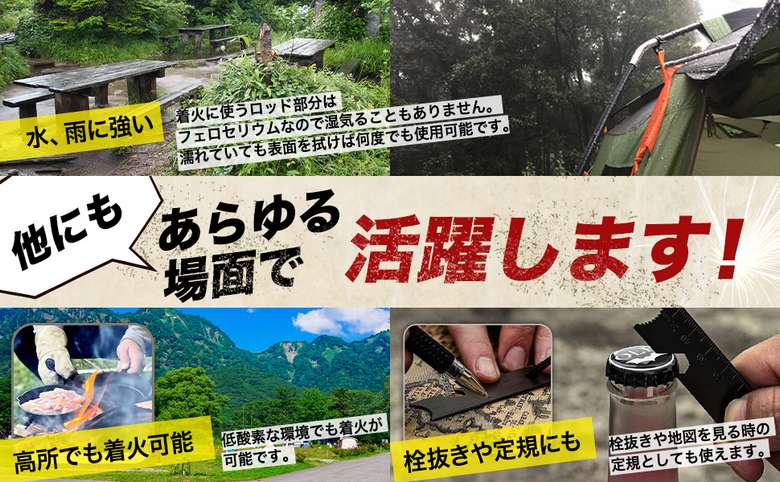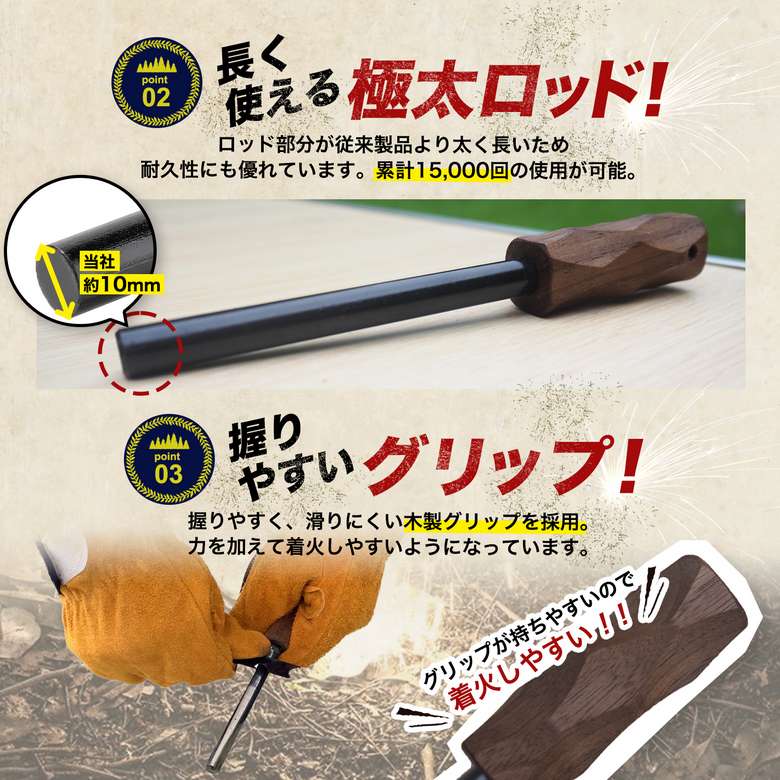 「極太ファイヤースターター」は、ロッド部分を太めにすることで「15,000回」の摩擦回数に対応。長期間の使用も可能だ。
