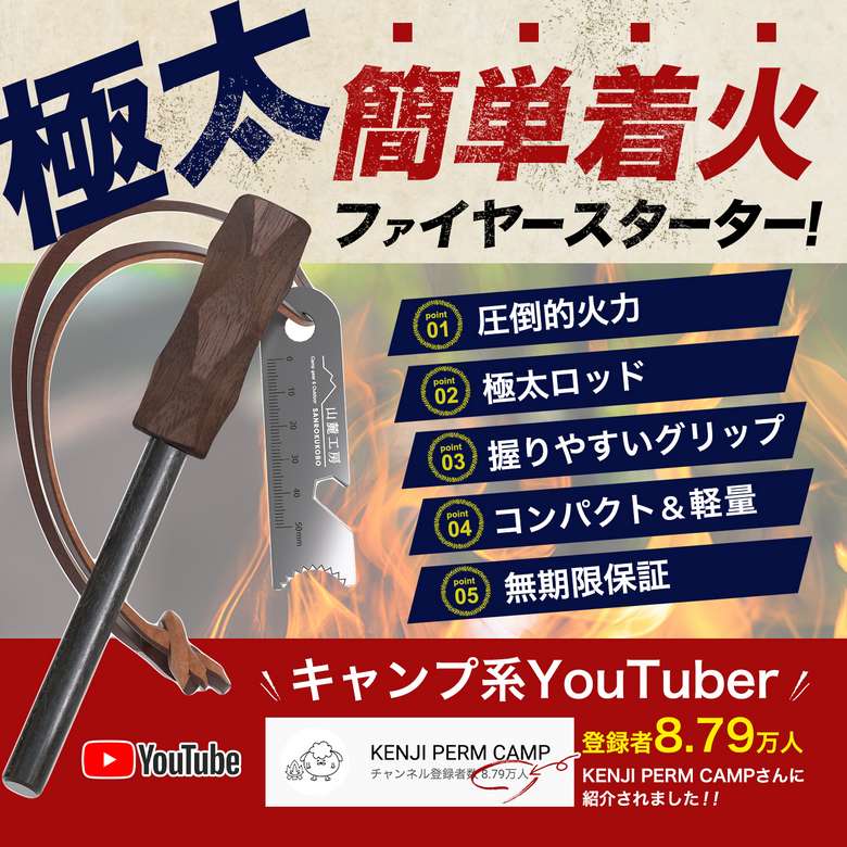 ~圧倒的火力で簡単着火!ストローク部分が長くしっかり擦れるため、軽い力で大量の火花を出すことが可能な一品。キャンプ系YouTuber「KENJI PERM CAMP」(チャンネル登録者数:87,900人)さんに紹介された!~