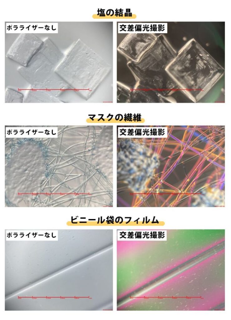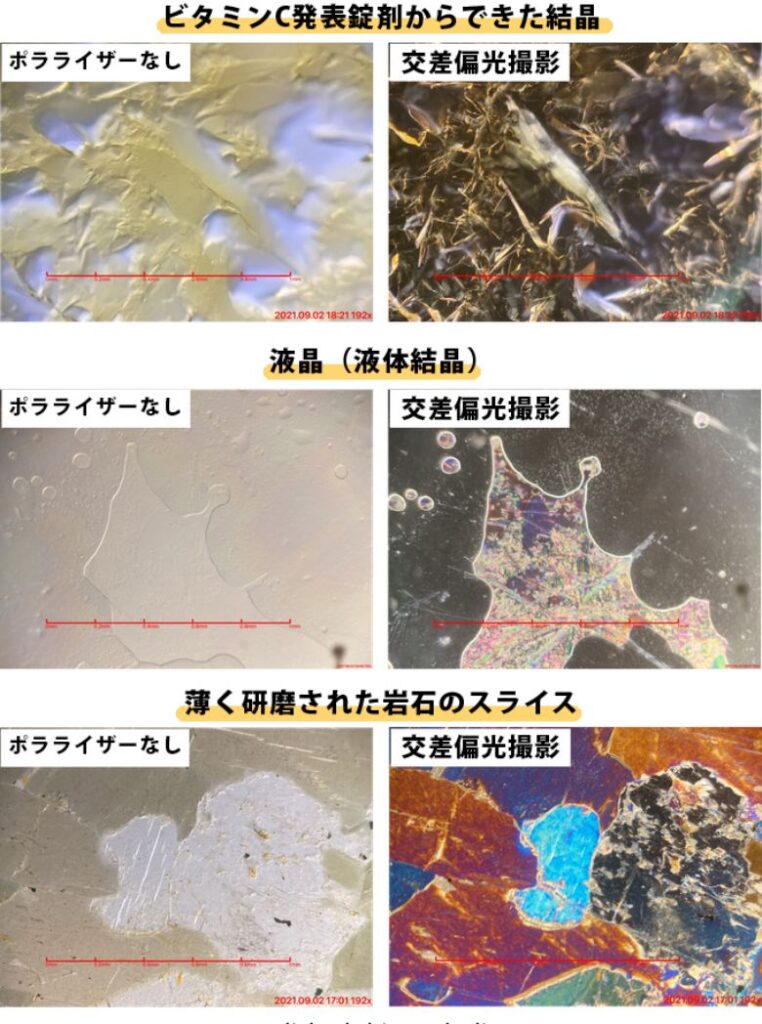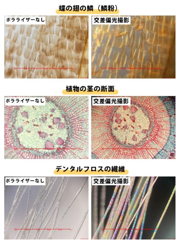 通常、透明な物体の構造や、状態、ひずみは、人間の目で見ることは容易ではない。しかし偏光顕微鏡を使うと、それらの物体の特性を色の変化や明暗に置き換えて観察でき、物質の様々な情報を得ることができるのである。