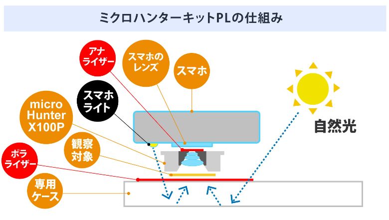 なお、ミクロハンターキットPLは下図のような仕組みで偏光顕微鏡撮影をしている。