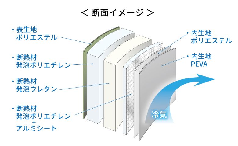 ソフトクーラー最強を目指すために、何度もテストを繰り返した結果、内生地を2枚組み合わせ、3つの断熱材で保冷力をアップさせた。