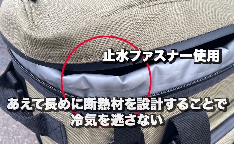 さらに、止水ファスナーを使用することで、内側の冷気が外に逃げにくいだけでなく、外からの水の侵入も防ぐ。