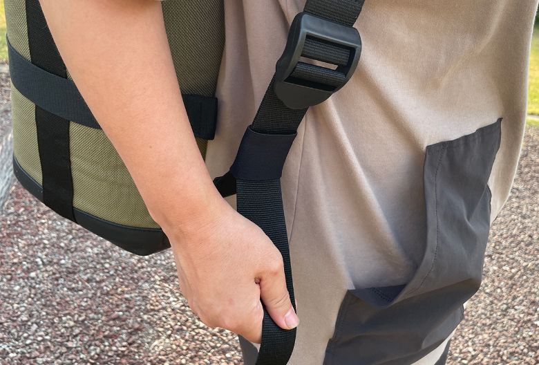 バックパックでの使用時のにこだわり、しゃがんでもゾルゲクーラーがずれにくいフィット感を実現した。