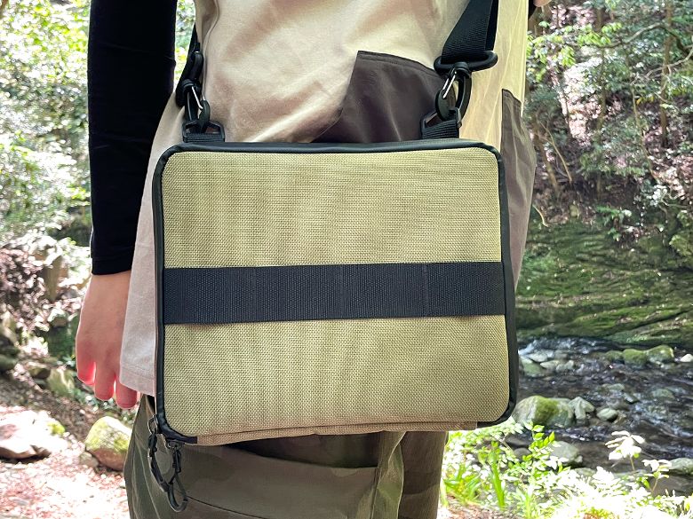フロントポケットは、取り外して椅子やテーブルに引っ掛けたり、サコッシュとしても使うことができる。
