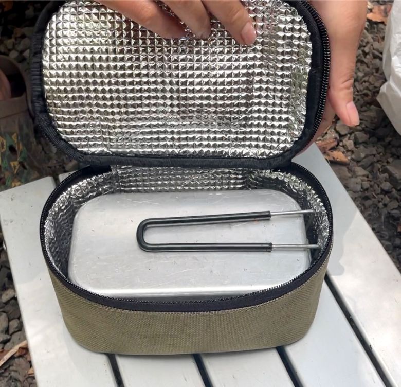 さらに、保温中のメスティン入れてもそのまま持ち運べるハンドル付き。当然だが、メスティンケースは、お弁当ケースや調味料入れにも使える。