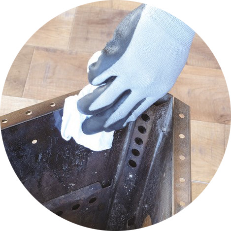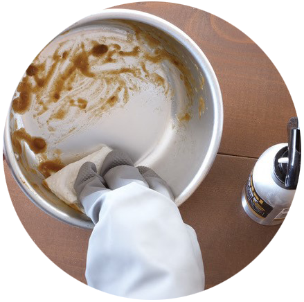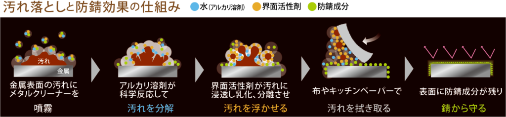 アルカリ溶剤が汚れを分解し、界面活性剤が汚れを浮かせて水となじませるので、布で拭き取るだけで汚れがするっと落ちます。拭き取った後には防サビ成分が残り、金属をサビから守ります。