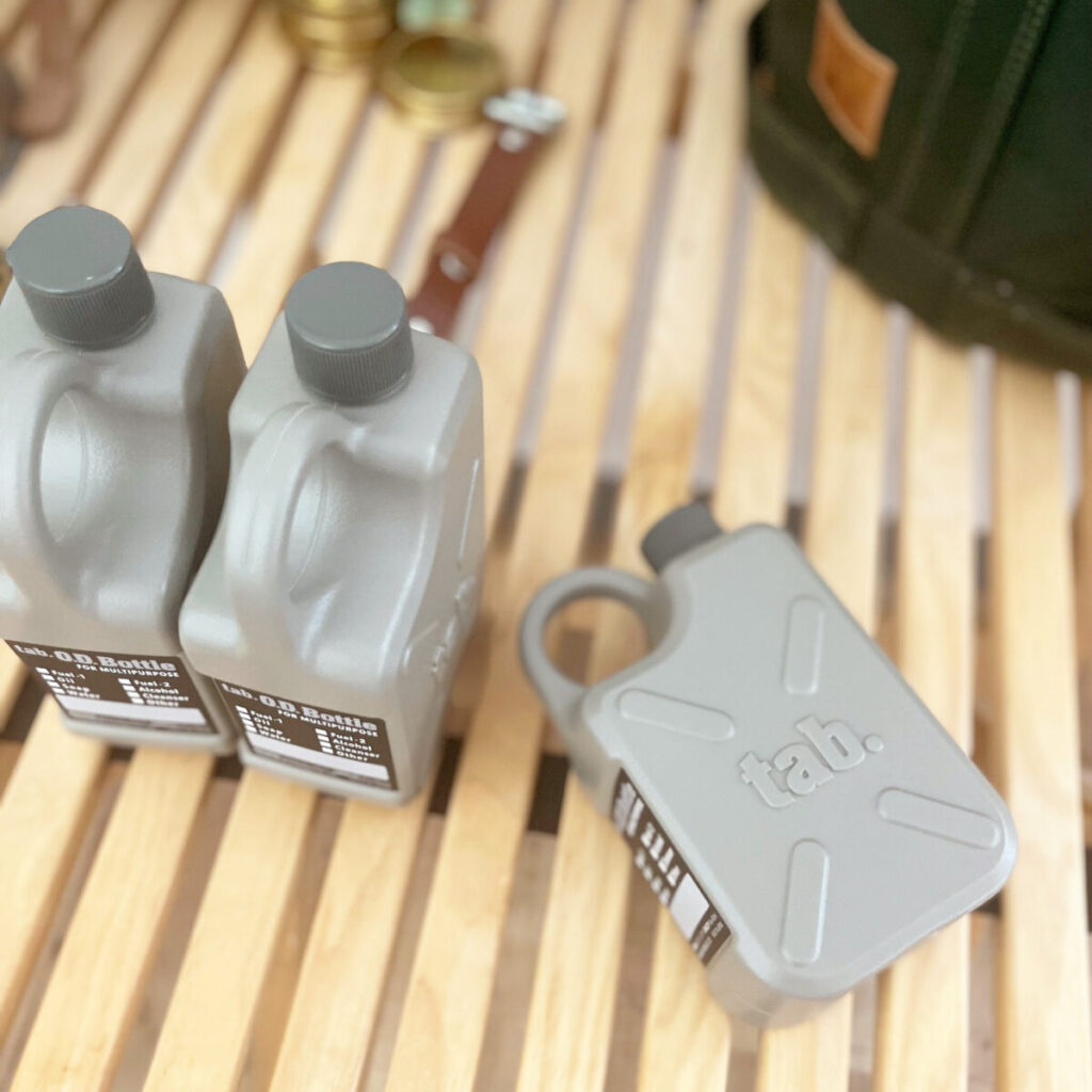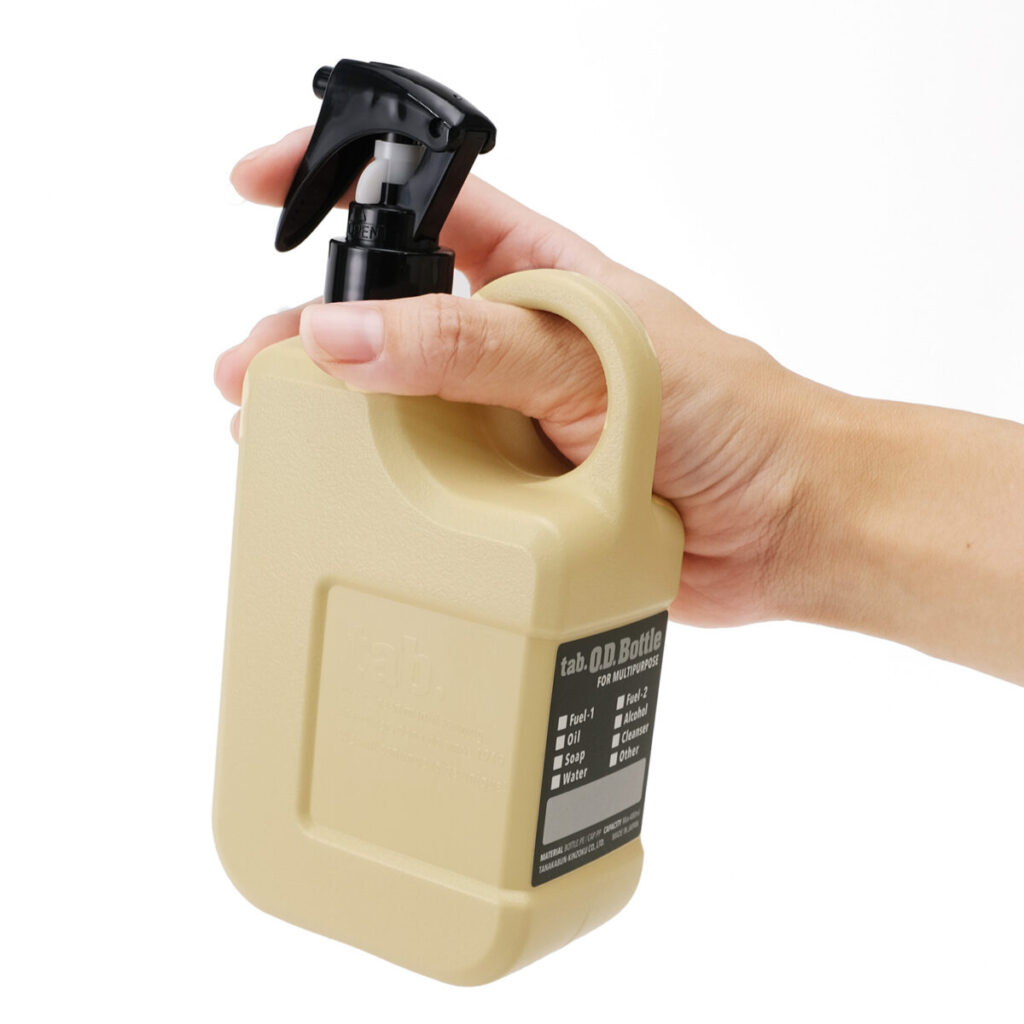 注ぎ口の口径は 22mmとなっており、 「tab.OD メタルクリーナー」 のスプレーノズルや、 市販の洗剤などのポンプノズル が取り付けられます。 ボトルのまま霧吹きとしてやポンプとしても使えるので、 アウトドアシーンでの使用以外にも、 日常的 に除菌スプレーやハンドソープ、 洗剤などのディスペンサーとしても使えます。
