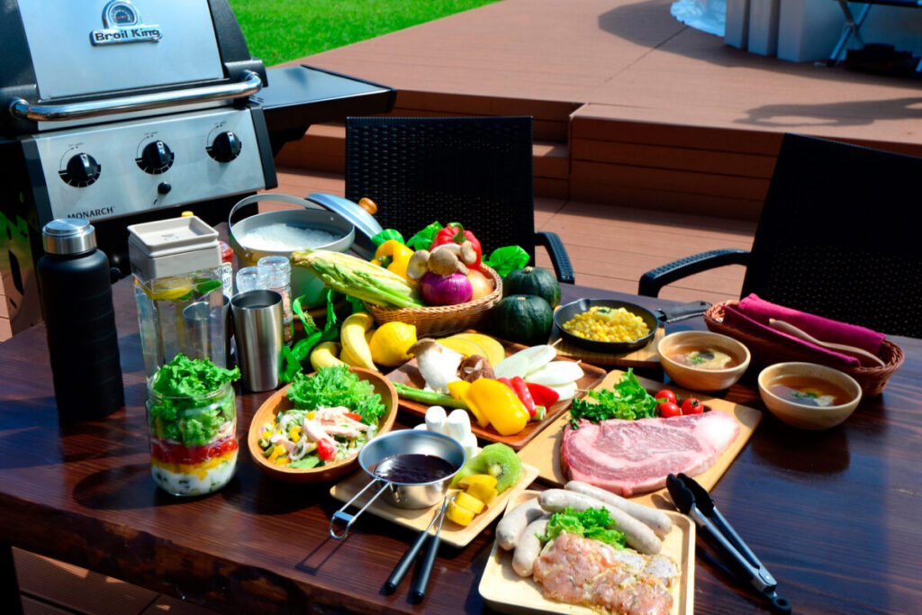 地元日光のブランド牛「霧降高原牛」ステーキをメ インに日光 HIMITHU 豚のソーセージ、とれた て野菜に湯葉スープなど地元食材にこだわったバー ベキュー、朝は日光御用卵と厚切りベーコンでイング リッシュマフィンに舌つづみ、質も量も大満足との お声を頂いております。