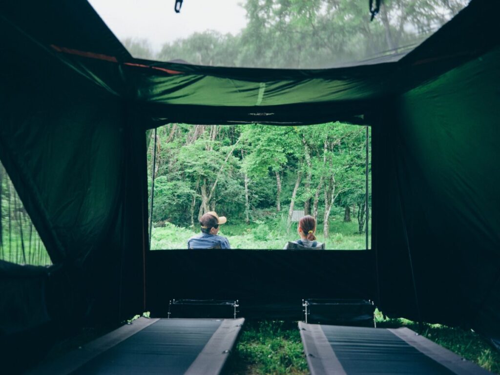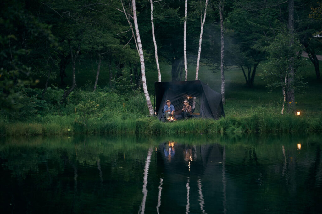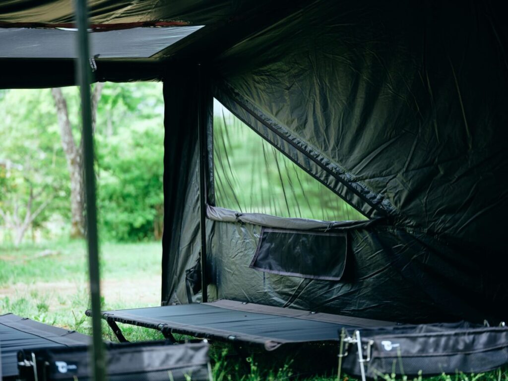 同製品は、仰向けに寝転んだ際にカメラのファインダーを覗いているかのような美しい風景を眺めることができる2名用テントとなる。入り口は作業しやすく高く設計され、奥にはコットを二つ置くスペースがあるのが特徴だ。また、テントの他にも「メッシュタイプのコット」や「オイルランタングローブ」も同時に予約販売を開始する。