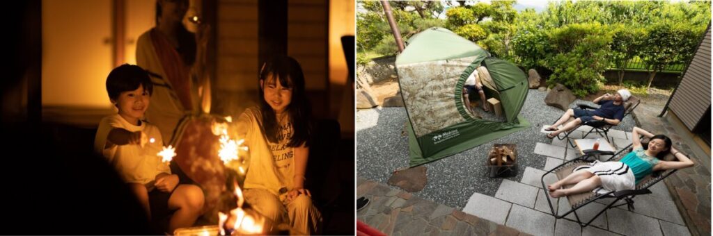 Temple Hotel法源寺最大8名宿泊可能で、1日1組の貸切宿。庭で焚火、BBQ、テントサウナも可能で、貸し切りで快適な宿とアウトドアの楽しさを両方楽しむことができる。
