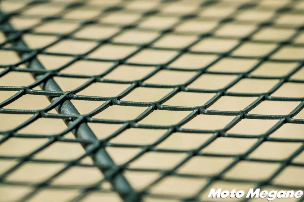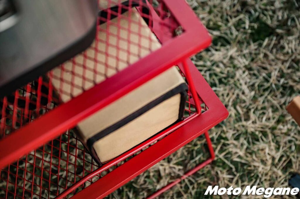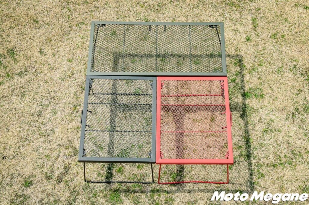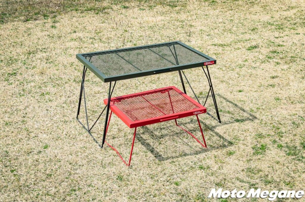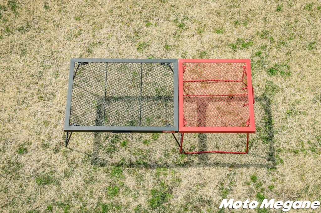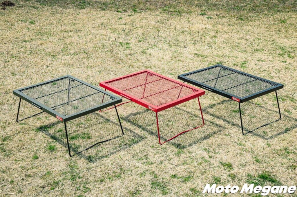 天板には「ラス網」と呼ばれる金網状の天板を採用している。剛性が高くてねじれに強く、鍋や食器などを置いても滑りにくいので、地面が少々傾斜していても滑り落ちる心配はない。