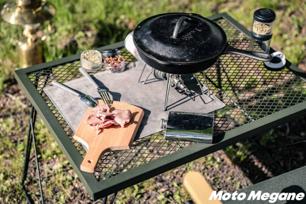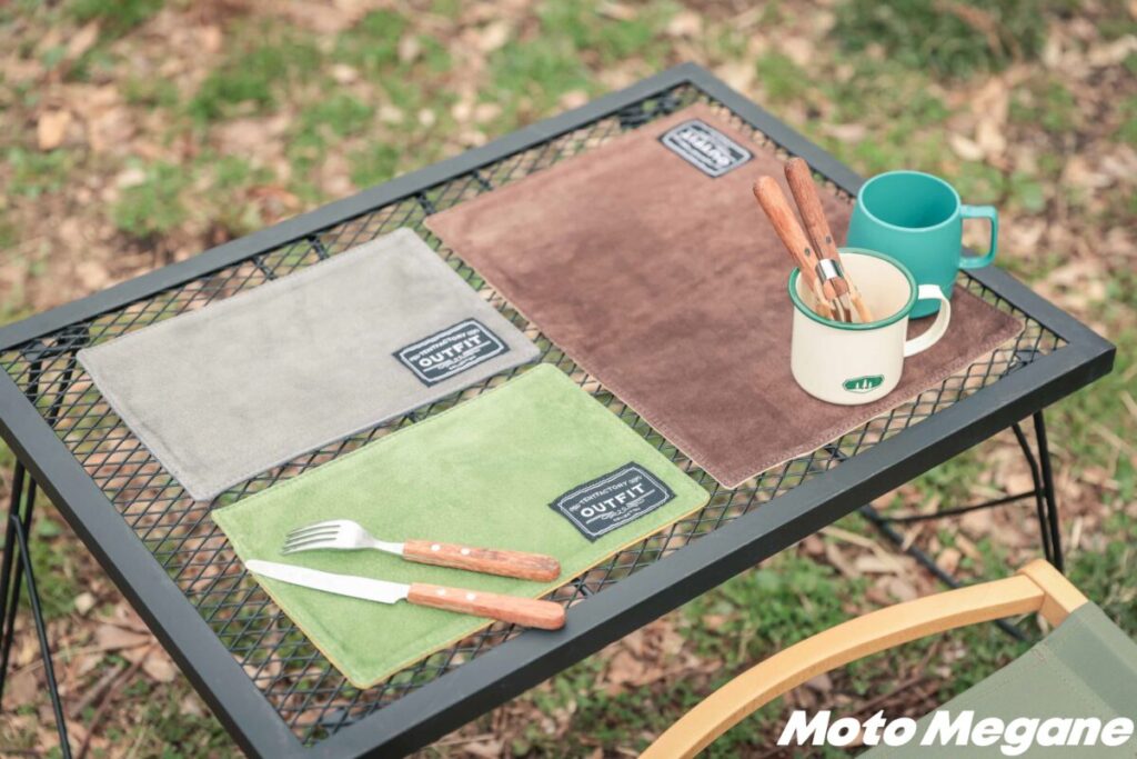 テントファクトリーの「スチールワークスFDテーブル」シリーズのようなメッシュ天板のテーブルに敷けば、小物が隙間から落ちなくなったり、滑りにくくなったりするので、使いやすさが向上する。