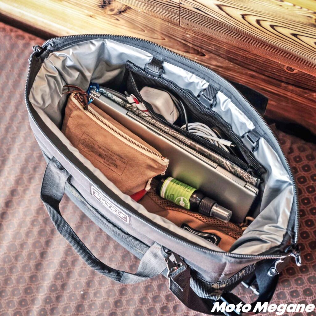 サイドバックルを外せば、トートバッグスタイルでも使用が可能。少し背の高いものを立てて入れたいとか、もう少し容量を増やしたいといったときにも便利だ。