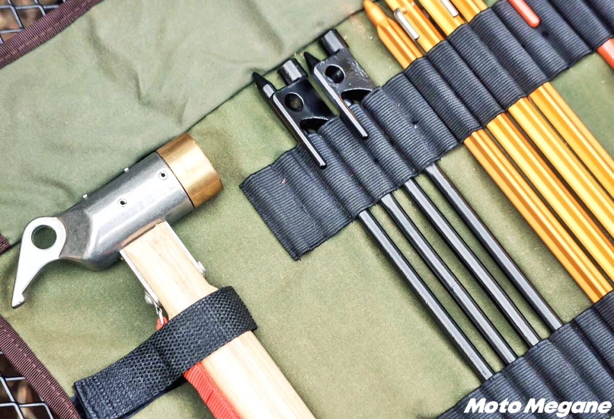 各ホルダーにハンマーとペグを収納。ハンマーは1本、ペグは30cmサイズを18本収納することができる。シンプルなソロ用ドームテントであれば、このようなセットひとつあればOKだ。