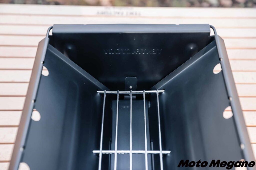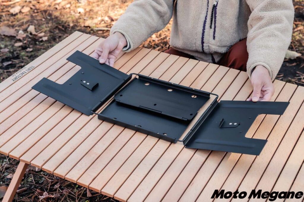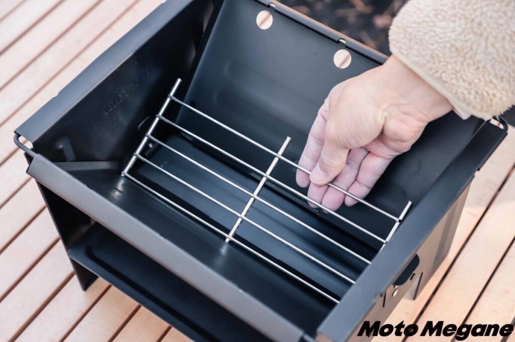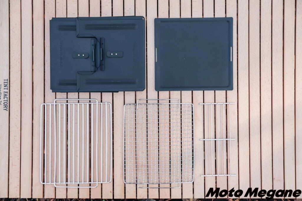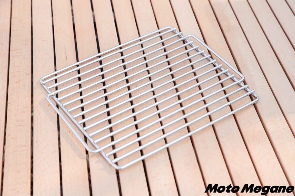 「FDグリル32-500耐熱 (ロストルセット)」のいちばんの特徴は、コンパクトに収納できるということ。約31.5×26×4cmという薄型サイズになるので、バイクでも積みやすいのはもちろん、家での保管場所もちょっとしたスペースがあれば収納できてしまう。