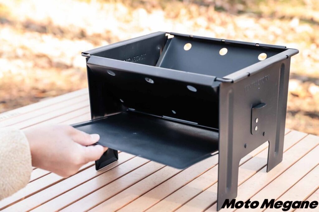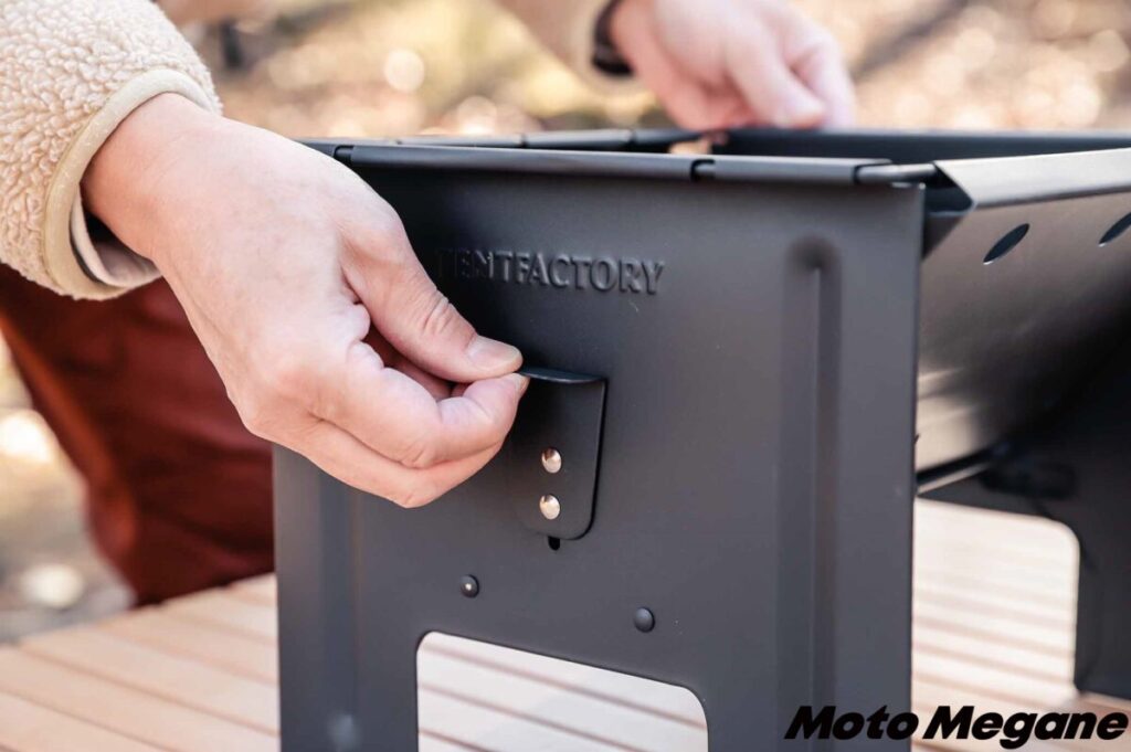 本体はスチール製で、耐熱500℃の粉体塗装が施されている。焼けて塗装が剥がれて、そこから錆びてしまうといった心配はない。カラーは汚れが目立たず、シックなキャンプサイトを演出するマットブラックというのもいい。
