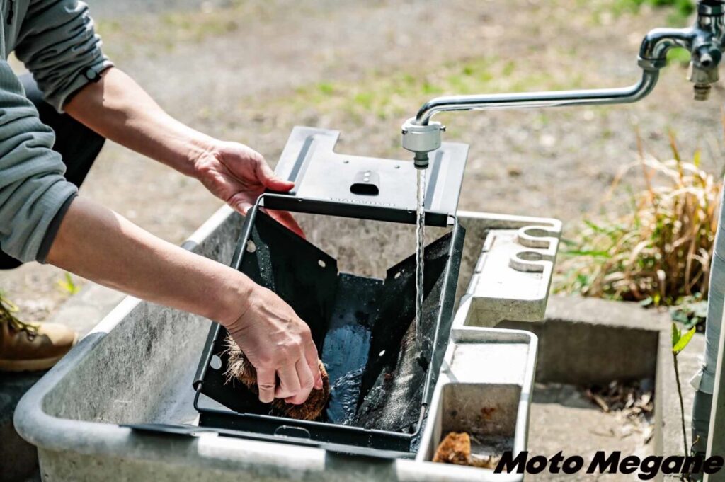 BBQや焚き火は、楽しんだあとの片付けが面倒だという人も多いが「FDグリル32-500耐熱 (ロストルセット)」は手入れも簡単。焼き網を外して底部に溜まった灰を捨て、あとは固く絞った濡れ雑巾で残った灰を拭き取るだけ。頑固な焦げ付きがある場合は、金タワシでこすり洗いすればキレイになる。
