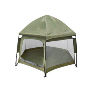 収納時88×13×15cm。使用時直径145cm、高さ125cm。約2.7kg。6本の骨組みで中心が一番高いサーカス小屋のような形状。中心部の高さが125cmで大人の男性でもゆったり入れます。6本の骨組みを外に倒し中心部を引き上げるとテントが広がり、わずか2秒で設営が完了。撤収時も上部中央内側のバーを上に引き上げることで一瞬で閉じ、簡単に片付けが可能。上部、前後横面(6面)すべてメッシュを採用。上部を覆って日差しを防ぐハーフフライシートが付属。