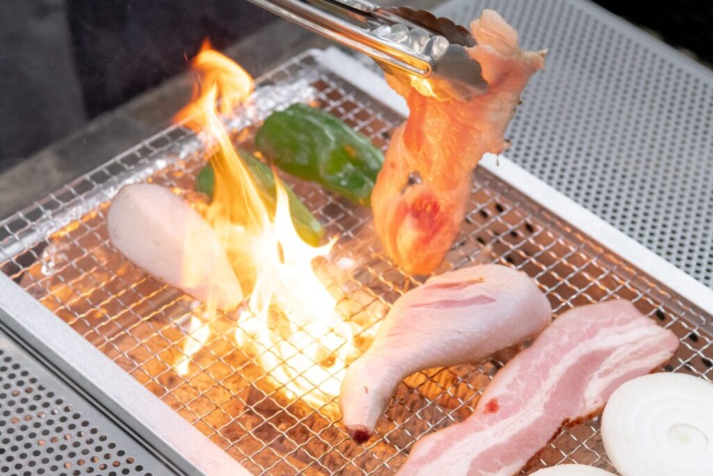 焼く人だけが立って焼くのではなく、座りながら皆で焼いて食べることができる焼き台付きテーブルを導入しました。