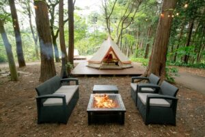 ウッドデッキの設置や、電飾のリニューアル、メニューリニューアル、テントサイト増設などレベルアップを重ねてきたRENO CAMP TORIYAMAは、この度ラグジュアリーなイス、テーブル、焼き台を導入しました。