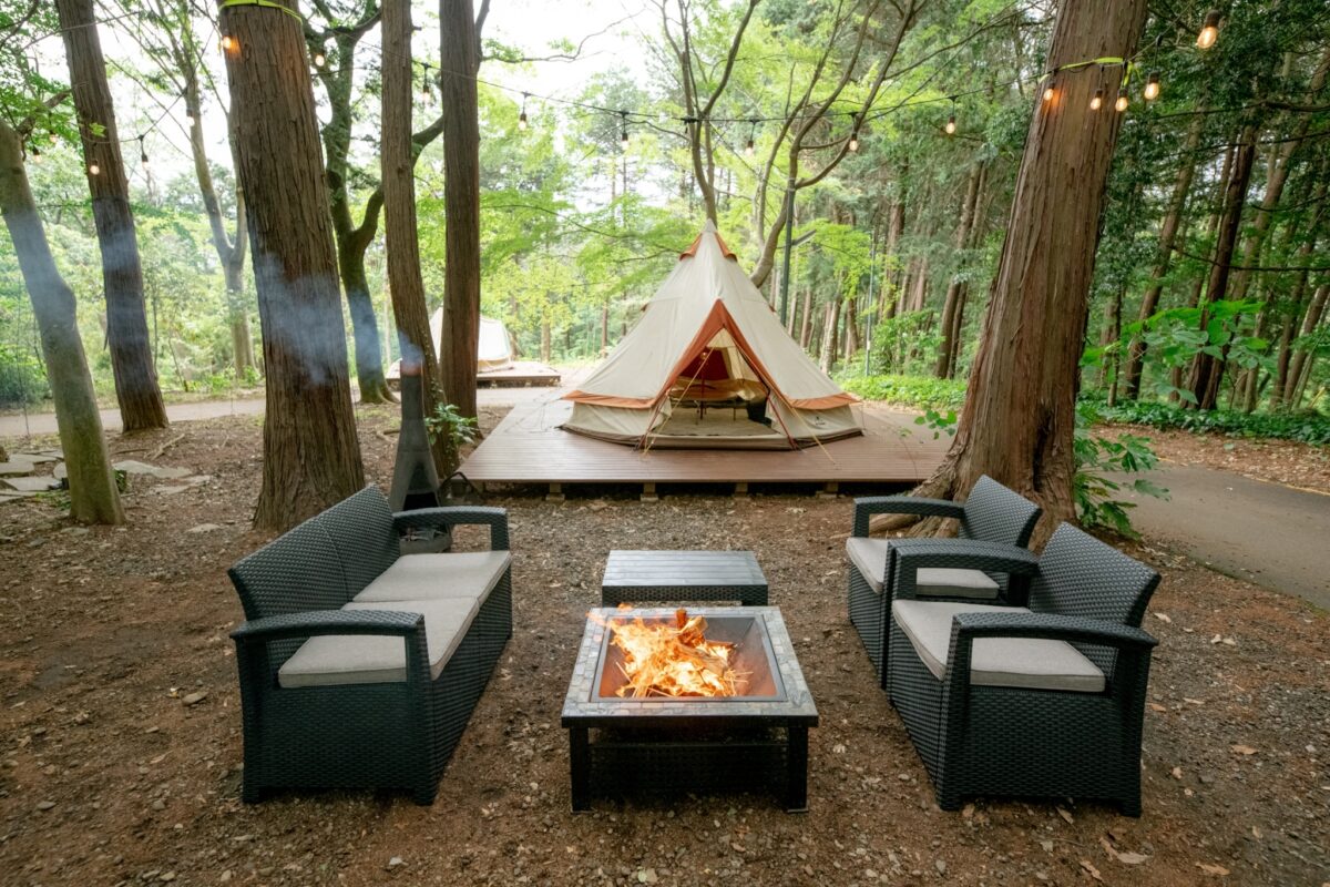 手ぶらでBBQ、テント、焚火が楽しめる施設。完全予約制。