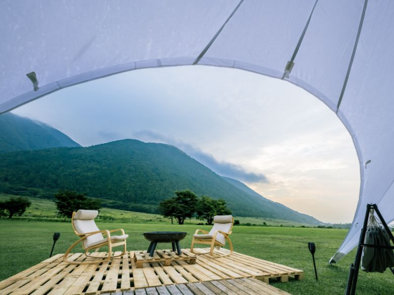 約5万年前の噴火によってできたカルデラ内に広がる草原で、快適な宿泊と、地元食材に舌鼓が打てるようになっており、特別な一時が堪能できること間違いない。