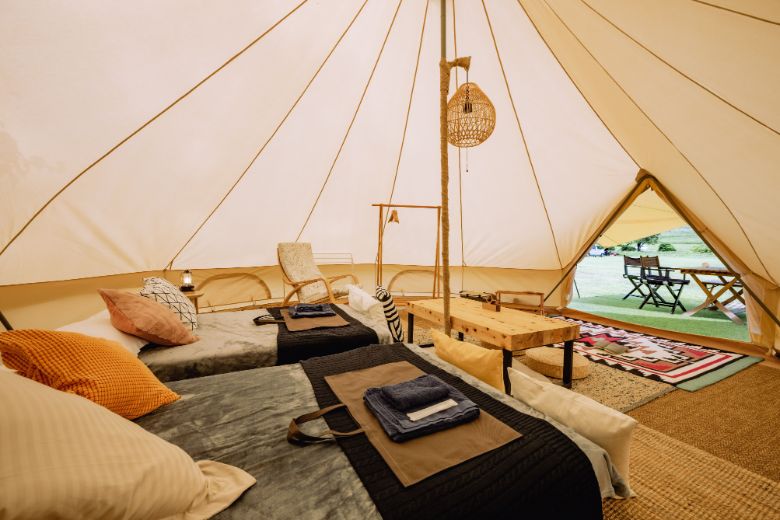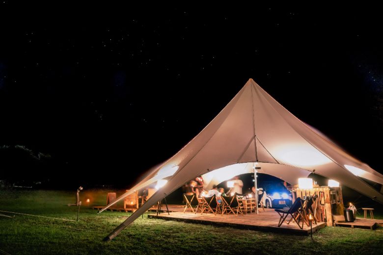 場内設備:客室テント(4室)、ファイヤープレース、パーソナルモビリティC⁺walk T(8台)、超小型電気自動車 C+pod(2台)、他