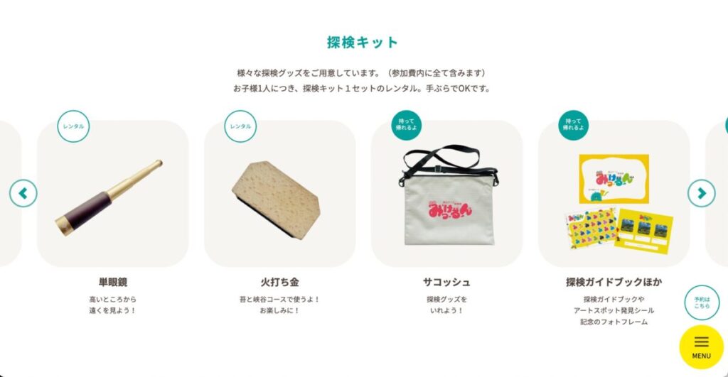 多彩な探検グッズを手に、子どもたちが探検隊の隊長となって地図を見ながら地域の自然の中に隠れた「アート」を発見していく新感覚のアクティビティは子どもたちを自然に触れさせたい両親のニーズに応える人気の体験パッケージ。