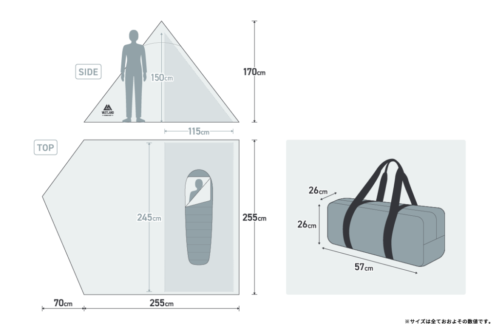 | 製品サイズ(展開時) | アウターテント:約)幅255cm×奥行255cm×高さ170cm インナーテント:約)幅245cm×奥行115cm×高さ150cm |