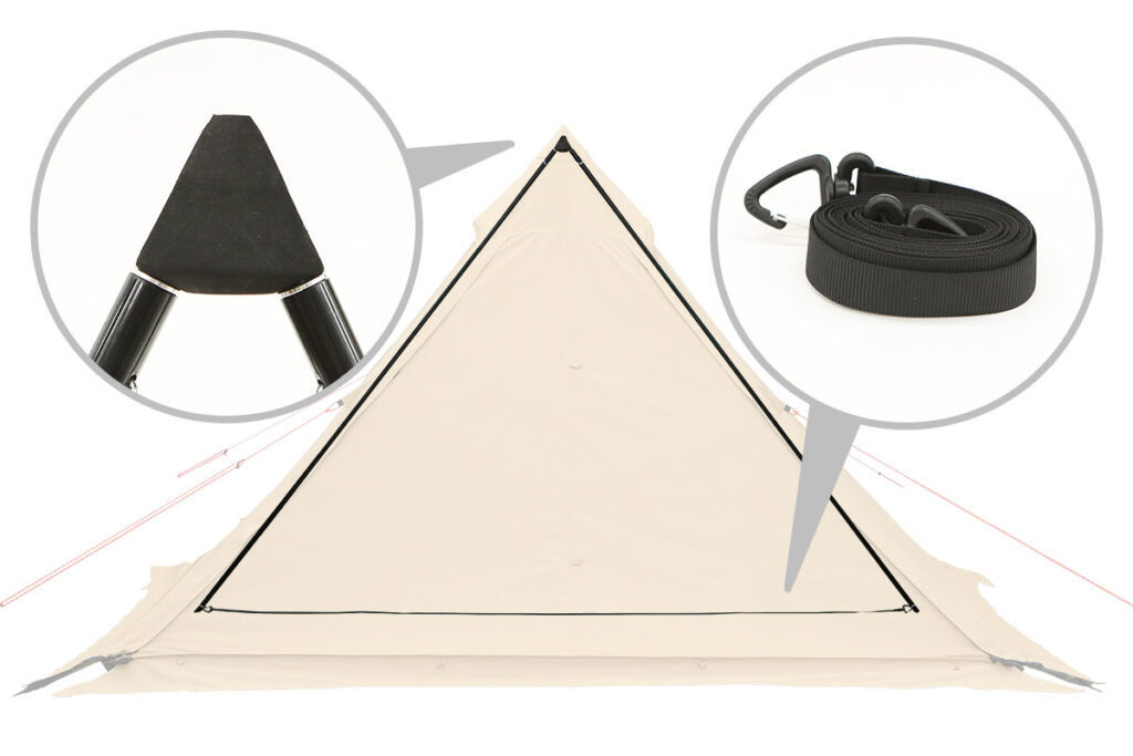テントの支柱をワンポール or 二股にできるよう先端キャップと二股用のガイドテープを付属しています。先端キャップを使用することで、ワンポール状態でもテント上部のシルエットがきれいになります。