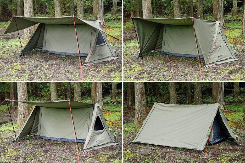 フロントドアパネルを拡張したり、様々な場所に巻き上げ可能なトグルを配置しているため、お好みに応じて設営スタイルを選べます。