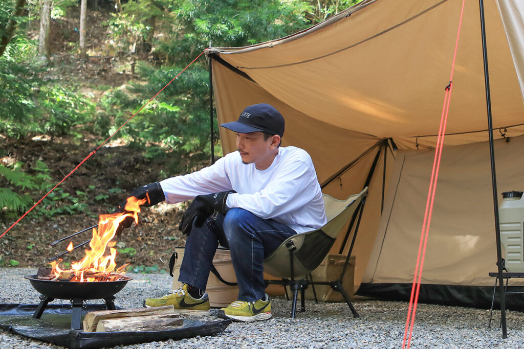 テントの近くで焚き火を楽しむことができるTCパップテント ソロ