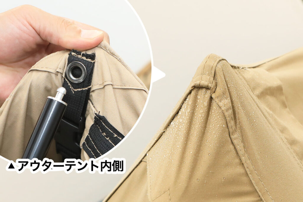支柱ポール先端をテント外側に貫通させ固定する形状ではなく、支柱ポール差込口がアウターテント内側に内蔵されているため、支柱ポール先端からの水の侵入を大幅に軽減します。