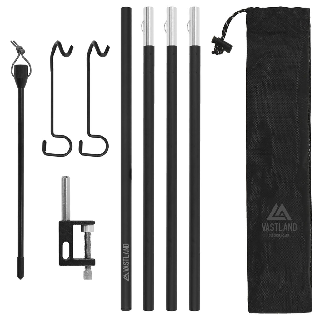 - 梱包品:上部ポール×1、中間ポール×3、ジョイントピン×1、ペグ×1、クランプ×1、フック×2、収納袋×1