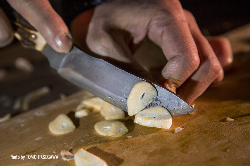 柔らかいものを切る事と、硬いものを削ったり割ったりする二刀流の性能を一本のナイフにて実現する事を目的に設計しました。