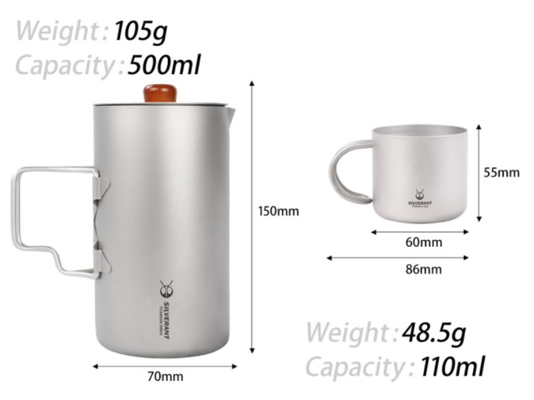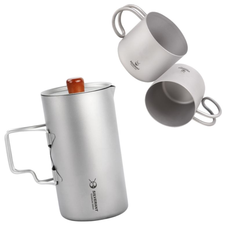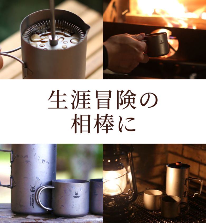 海外キャンパー愛用のチタン製品ブランドSilverAntから、コーヒーフレンチプレスとカップセットがMakuakeで販売を開始した。