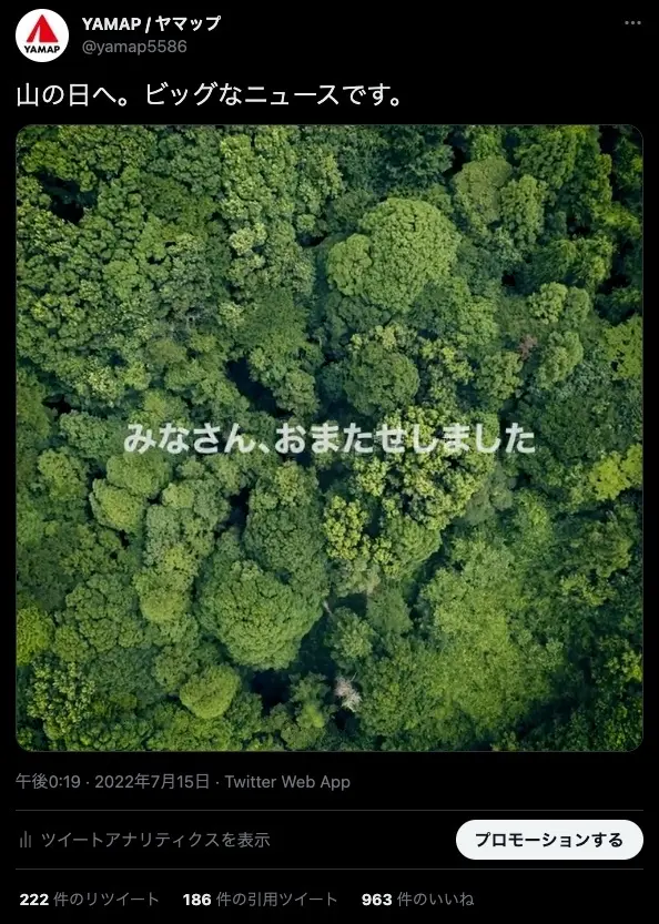 ※2 https://twitter.com/yamap5586/status/1547782901172908035 | YAMAP公式Twitter(@yamap5586 )にて7月15日に初公開した予告動画